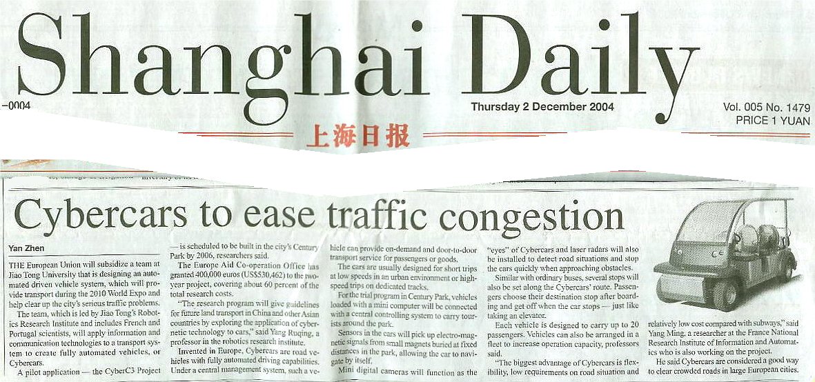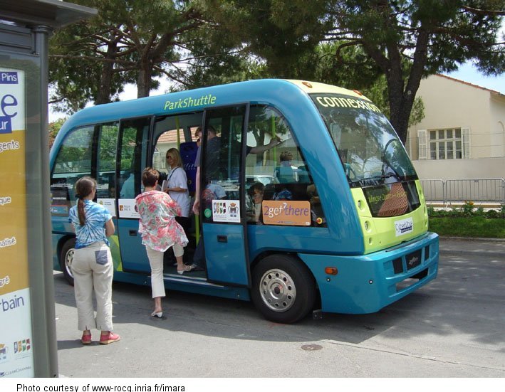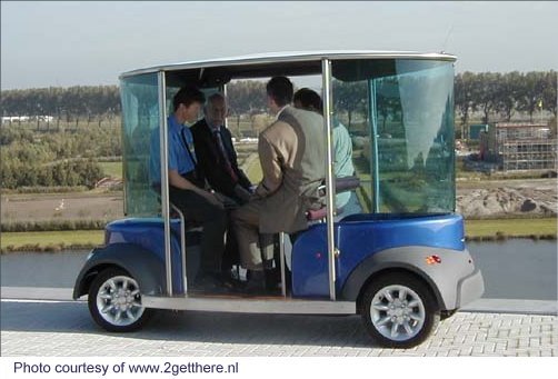May 2005 - Pictures of Toyota IMTS at Expo 2005 in Japan. [More in left-hand column] December 2004 - Joint EU-China project. A system of small, driverless, electric cars is scheduled to carry tourists around Shanghai Century Park starting in the 2nd half of 2006. June 2004 - Test of ParkShuttle II driverless minibus in Antibes, France. Rides were provided for 4,000 citizens. Maximum speed was 25 km/hr (15 mph). |