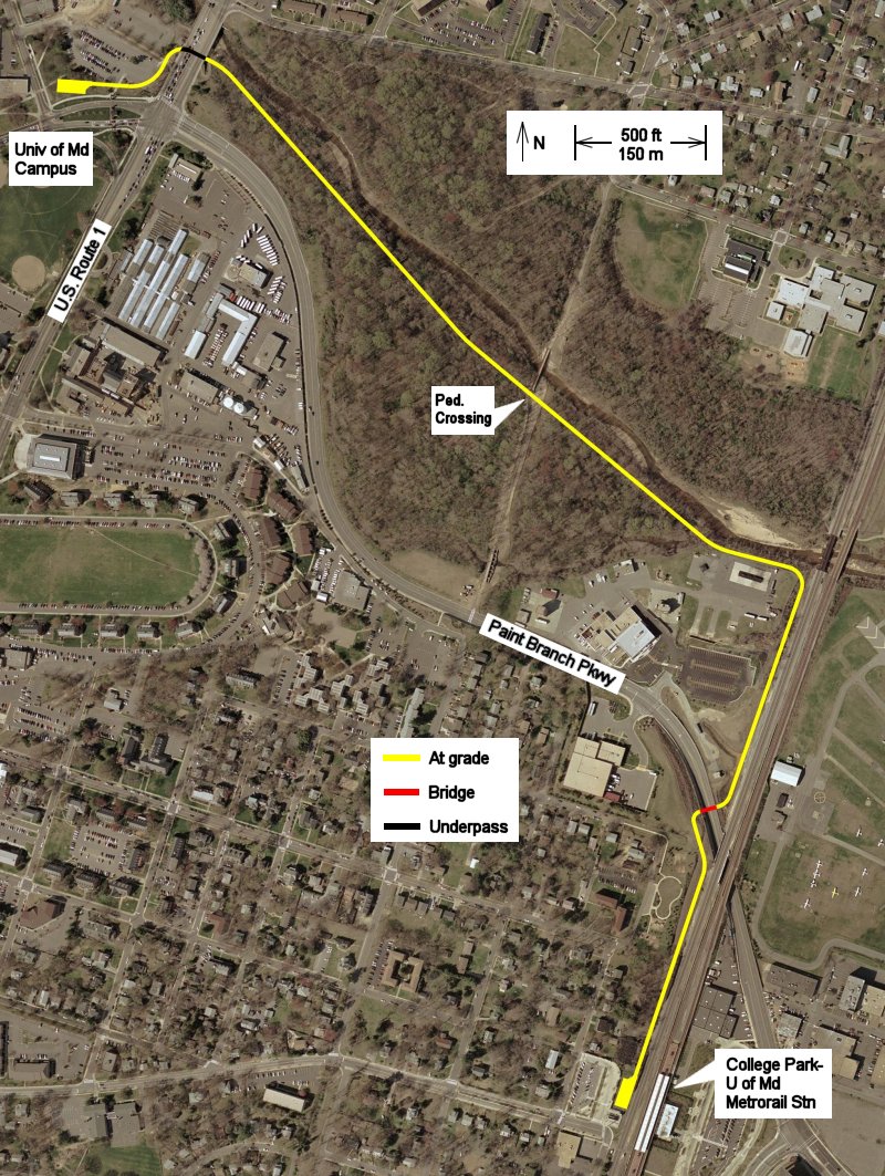 The proposed Microbus system connects a heavy rail station just outside of Washington, DC with the main campus of the University of Maryland, a distance of 1.06 miles. There are only two stations. The route runs northward from the rail station parallel to the rail line, and crosses Paint Branch Parkway via a new 65-ft bridge. It then passes through a wooded area, crossing a low volume pedestrian path at grade. Finally, it runs under U.S. Route 1 in space that's currently unused in an existing underpass, and ends at the eastern edge of the campus. Cost models for the Microbus roadway and bridge give values of $1.2M and $0.25M respectively. The two stations and miscellaneous infrastructure are estimated to total less than $1M. Finally, about 15 Microbuses should allow service at one minute headways; these are estimated to cost $100,000 each. Aside from land acquisition, this gives a total cost of about $4M for a system approximately one mile in length. The service policy would be simple. A Microbus would leave every minute both peak and off peak if anyone was waiting. However, the trip would be canceled if no one was waiting and the vehicle was not needed at the other end. In case of a sudden spike in demand, such as when a Metrorail train arrived, multiple vehicles could be run with a minimum headway of 5 seconds. (This page is under construction) |