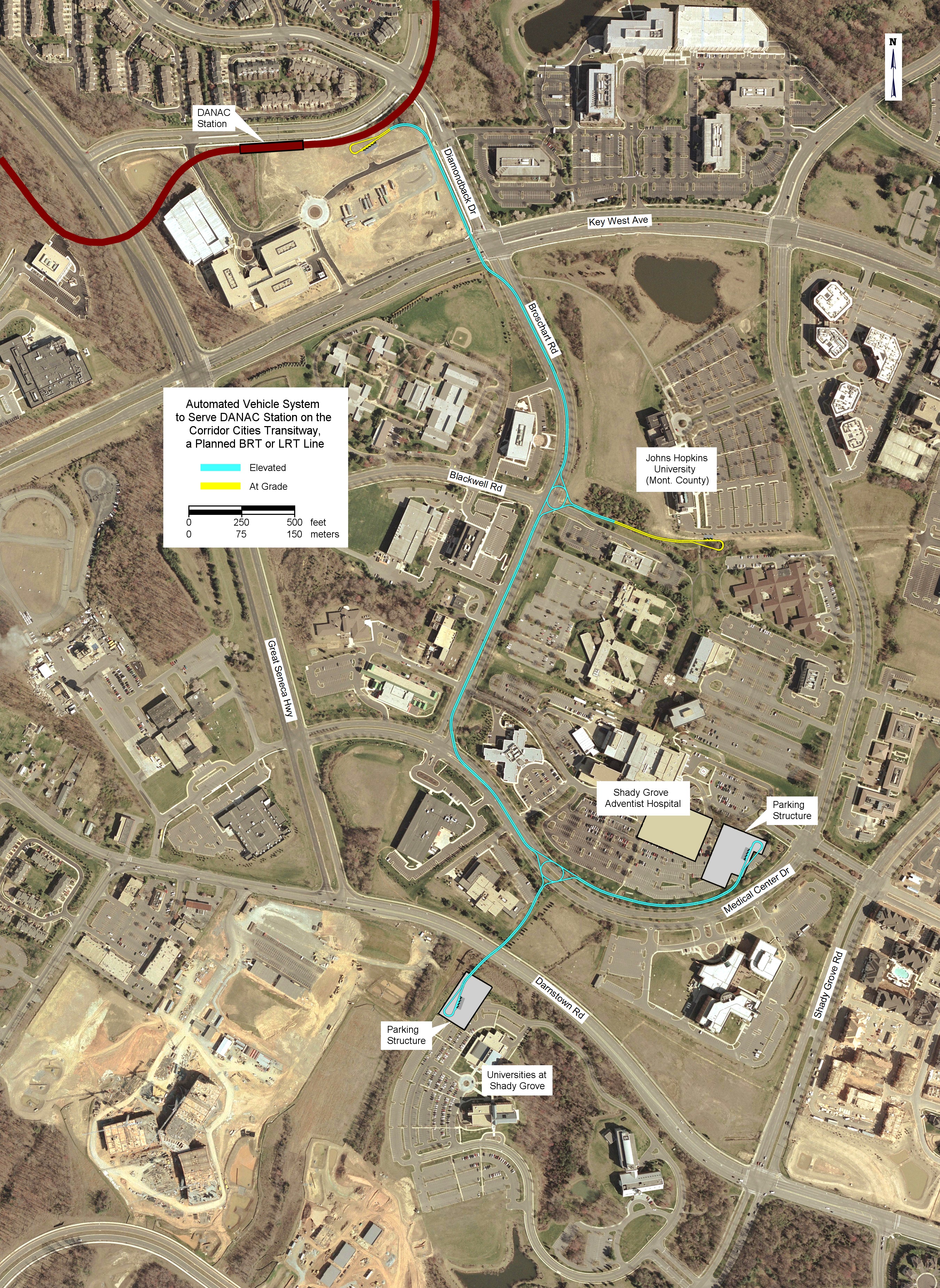 DANAC is one of 13 stations on the Corridor Cities Transitway, a planned BRT or LRT line in Montgomery County, Maryland, just northwest of Washington, DC. The CCT starts at the end of an existing heavy rail line, and runs west and then north for 14 miles (23 km). The diagram below shows how an automated vehicle system could connect DANAC station with a number of trip generators that are nearby, but beyond walking distance.